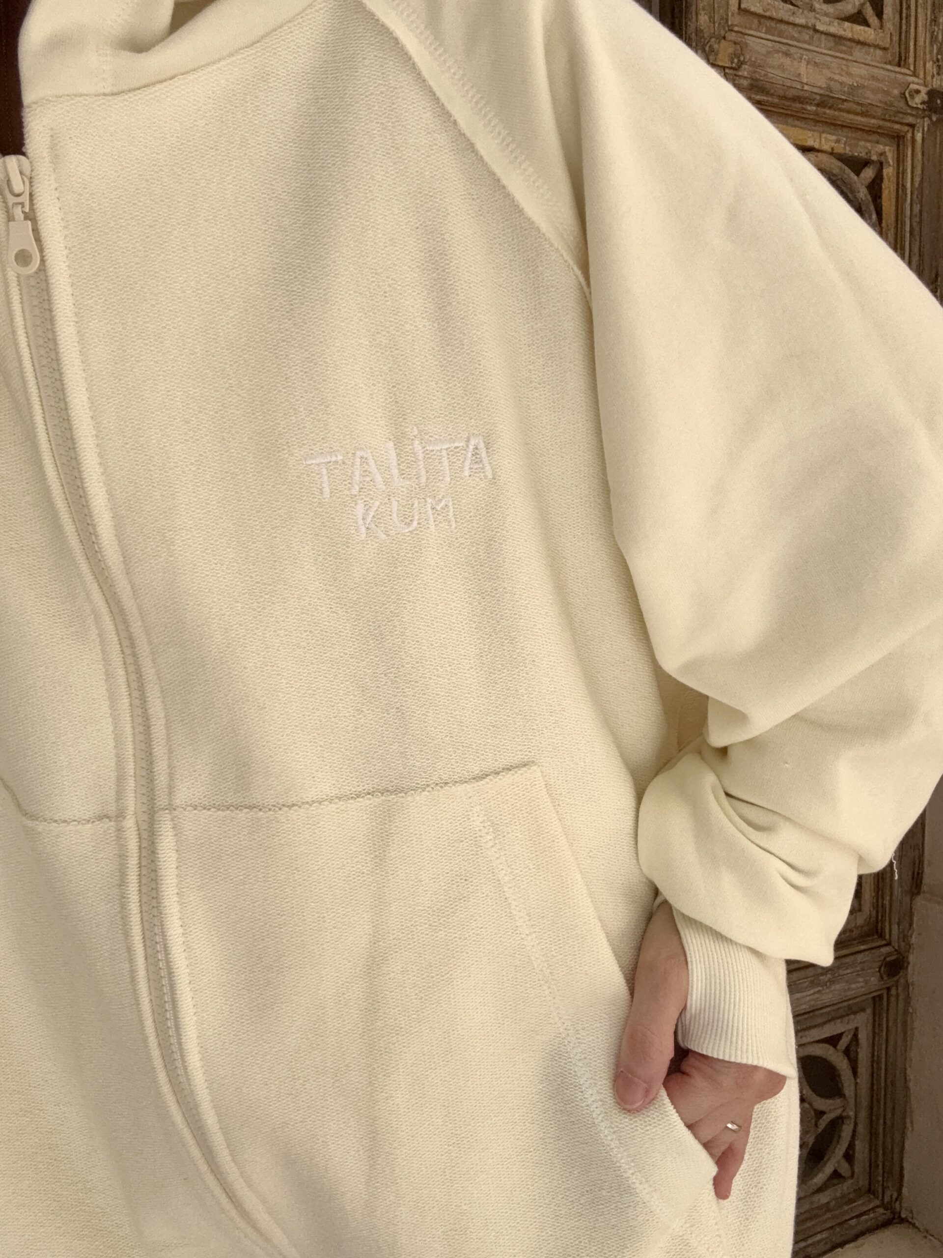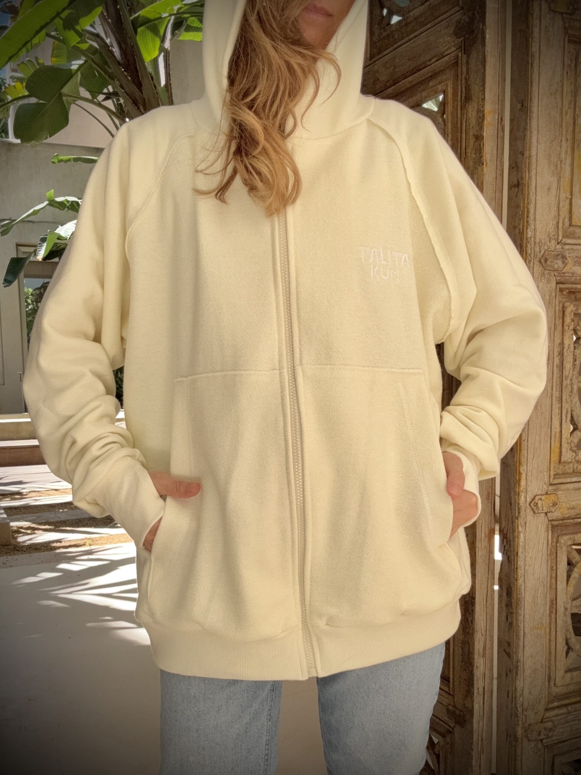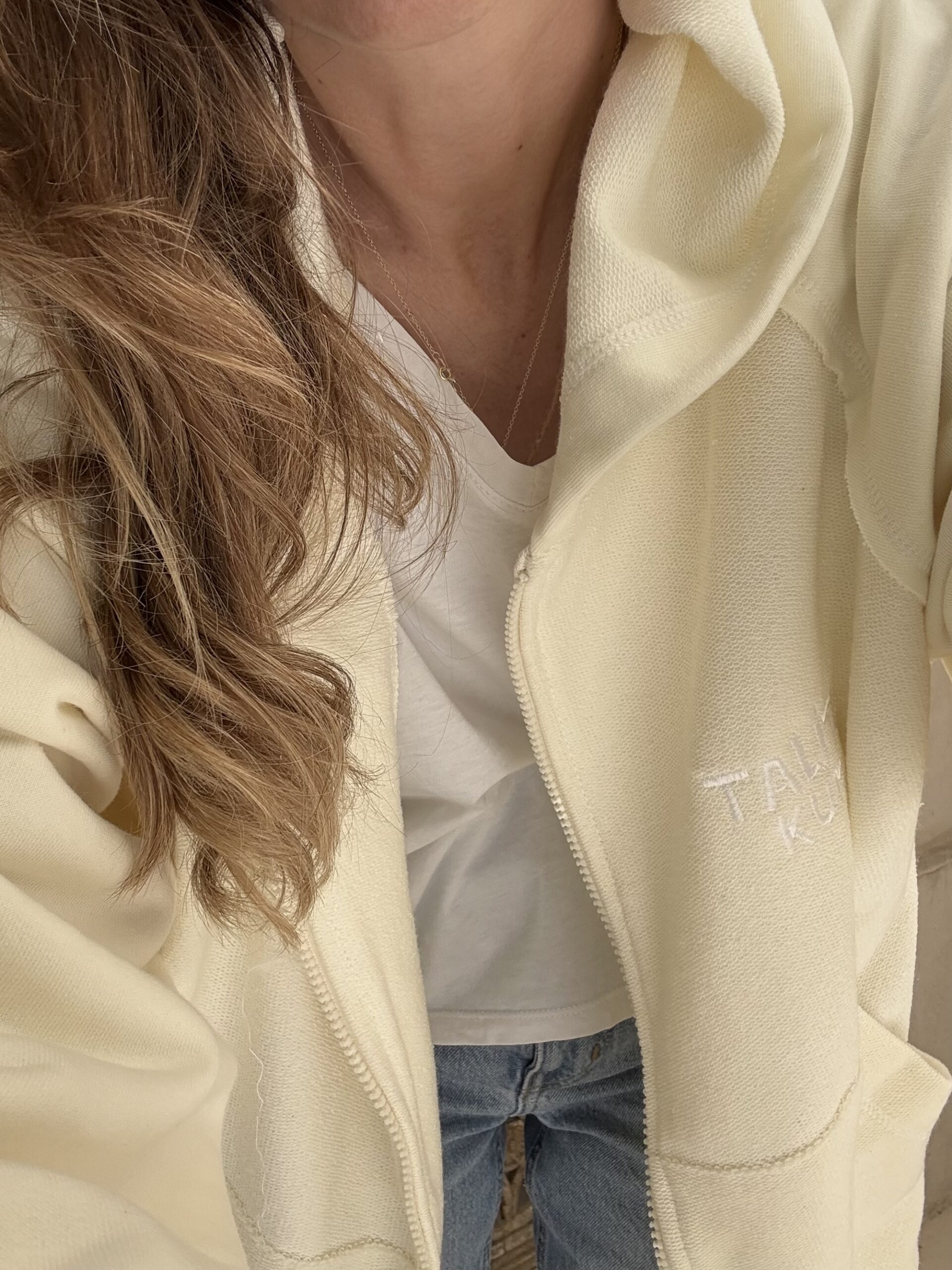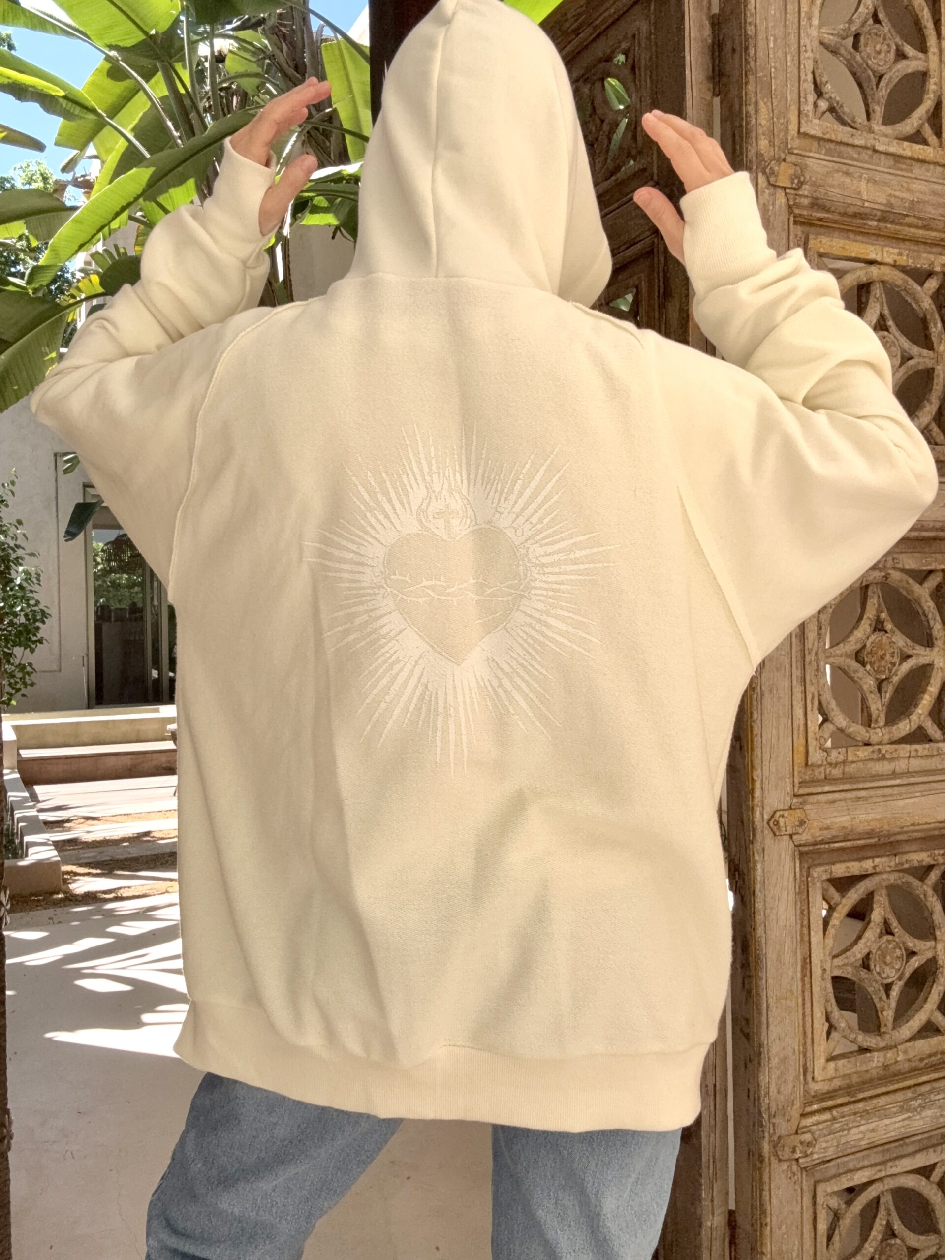 Camperita verano de algodón rústica 100%. Colore cremita/amarillo clarito… Inmaculado Corazón en blanco en la espalda. Logo bordado en el pecho. Capucha y puño para dedo gordo.